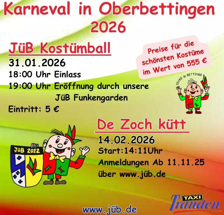 Hier seht Ihr unseren Karnevalsfahrplan für die neue Session 2026. In diesem Jahr neu ist das es einen Kostümball gibt. Für die schönsten Kostüme gibt es Preise im Gesamtwert von 555 Euro.